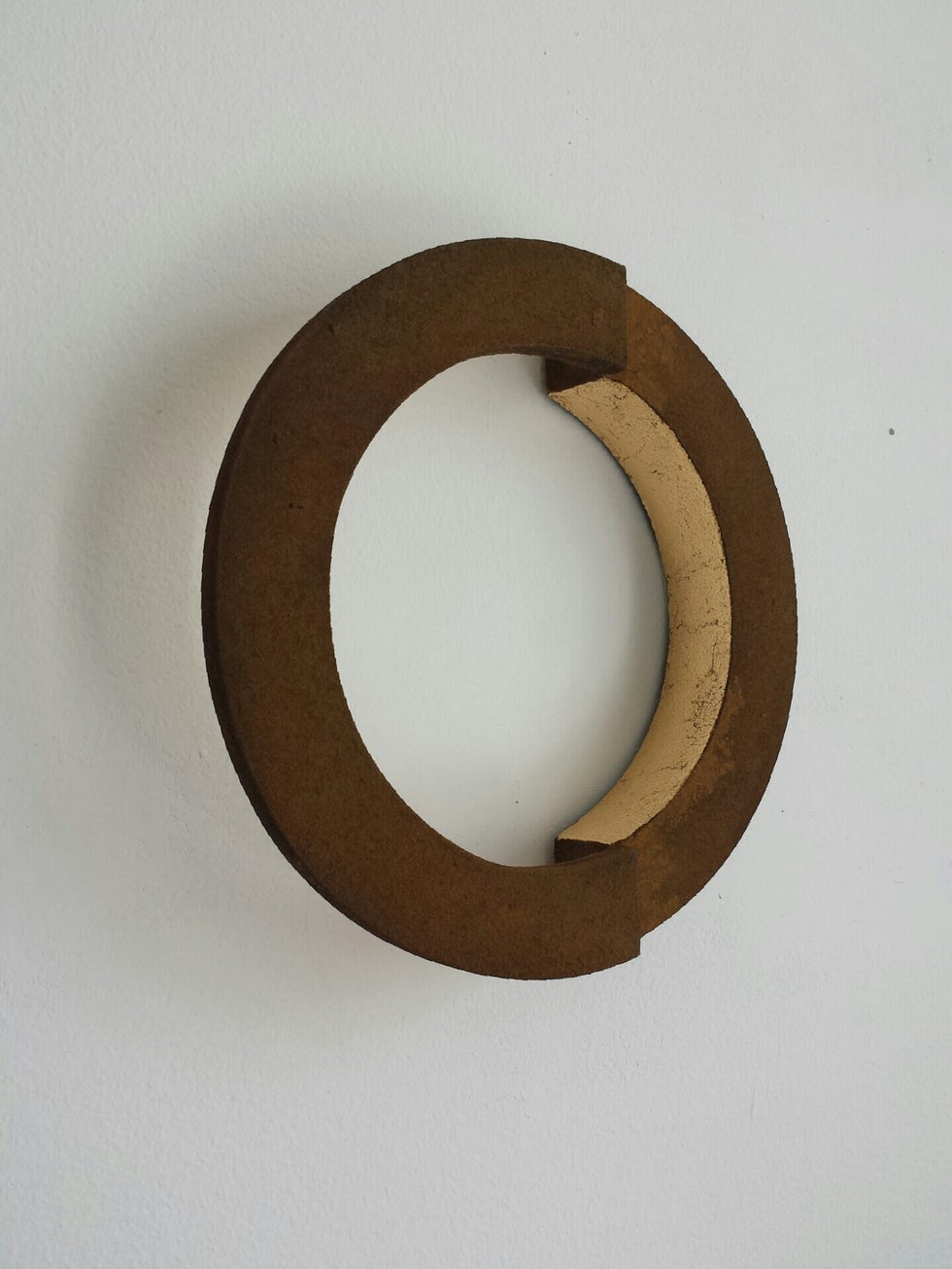 Een spel van cirkelfragmenten. De onderdelen bestaan uit in vorm gezaagde platen zink die aan elkaar gesoldeerd zijn. Het oppervlak is bewerkt met een zuur waardoor roestvorming ontstaat. Sommige delen zijn daarna bedekt met bladgoud. Je ziet een gouden weerkaatsing op de muur achter het werk.